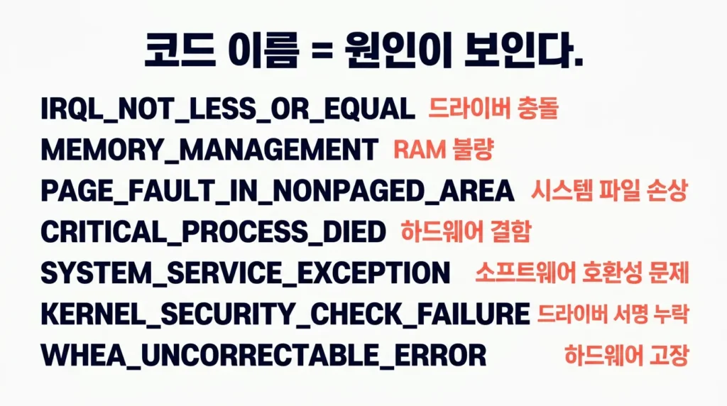 📌 핵심: 코드 이름을 보면 RAM·드라이버·시스템 파일 중 어디를 먼저 볼지 바로 알 수 있어요.