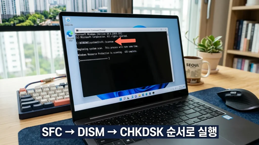 📌 핵심: SFC → DISM → CHKDSK 3단계 명령으로 시스템 파일·디스크 손상을 복구해요.